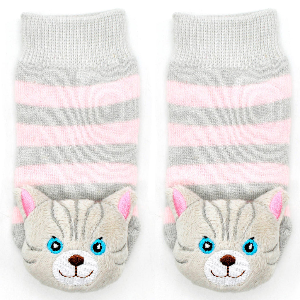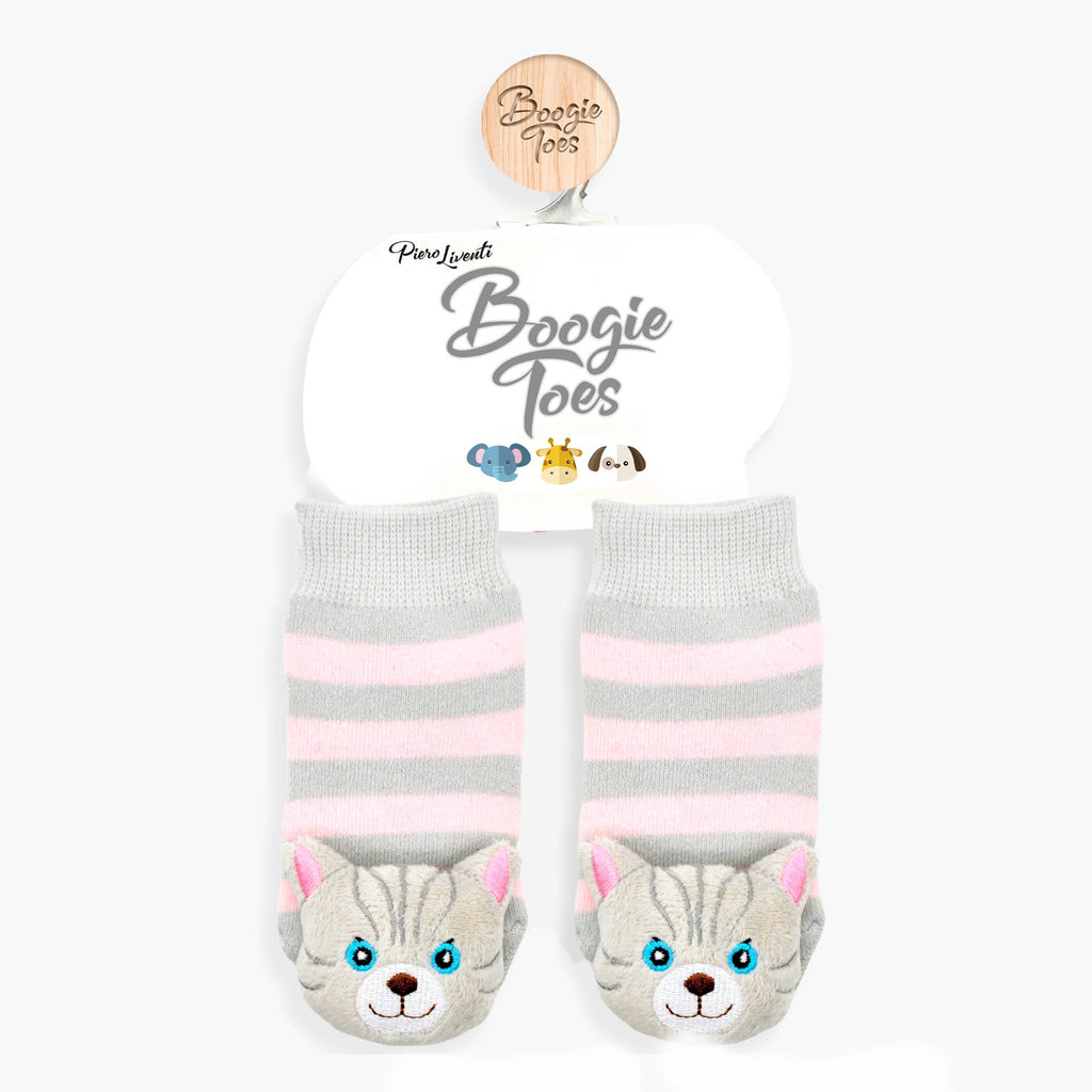 Blue-eyed gray tabby cats are the purr-fect addition to any kid's wardrobe. Little pink ears are perfectly complemented by pink sock-body stripes. Rubber grip-bottoms provide traction for new walkers, and adorable stuffed kitty faces double as rattles. Boogie Toes are the perfect addition to any kid's wardrobe and make great gifts too! 100% Combed Cotton Rattle Accessory Socks. Hand Linked. Satisfaction Guaranteed, 85% Cotton, 10% Nylon, 5% Spandex.