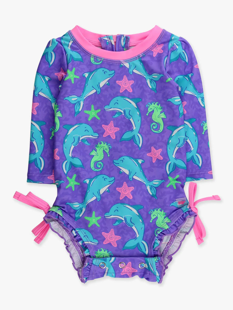 A charming addition to your little girl's swimwear collection, this bestselling baby one-piece blends comfort, style, and sun protection effortlessly. Made from soft, UPF 50+ fabric, it offers all-day coverage and peace of mind under the sun. Designed with convenience in mind, it features a back zipper and bottom snaps for quick and easy changes. Thoughtful details like playful leg ruffles, sweet bow accents, and our signature rear ruffles add the perfect finishing touch to this adorable swimsuit. Bright neon dolphins dance with swimming seahorses and starfish in this fun retro-inspired print! Pairs well with Bright Aqua, Neon Pink, Neon Magenta, Neon Honeydew, Neon Purple. Care Instructions: Hand wash cold with like colors; do not bleach; do not iron; line dry in shade Fabric Content: 80% Nylon, 20% Spandex